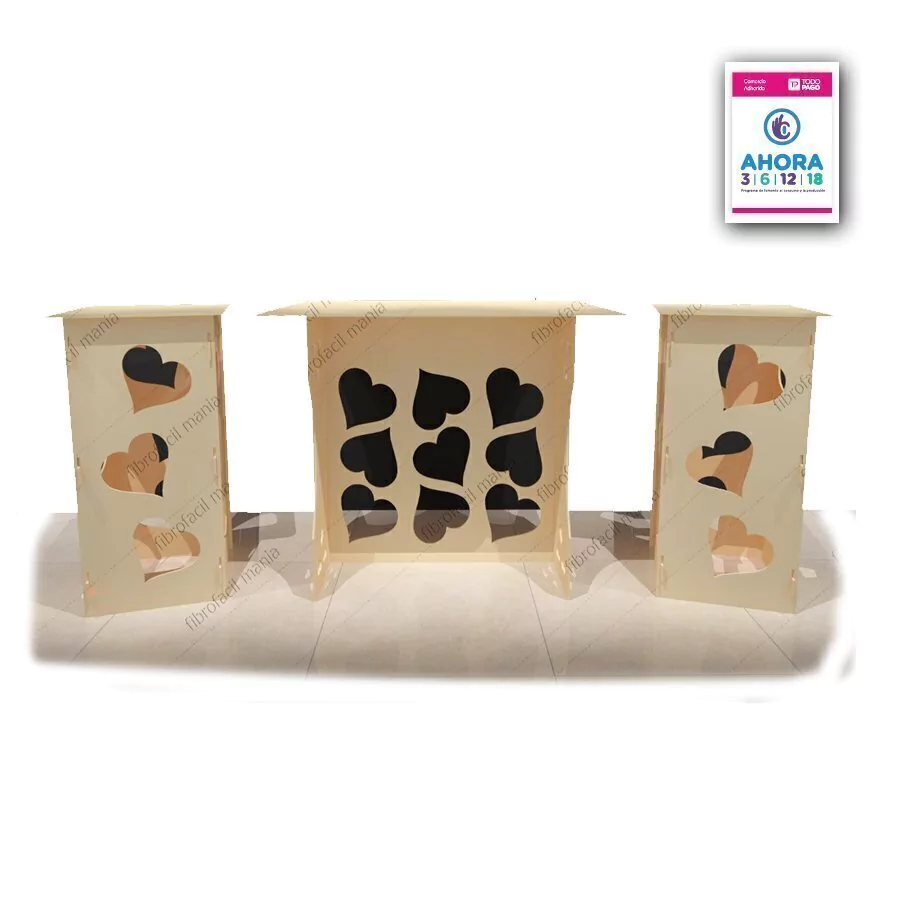 El kit incluye 2 cubos y una mesa Central grande de apoyo con diseño corazon calada, ideal para una mesa dulce impresionante.????