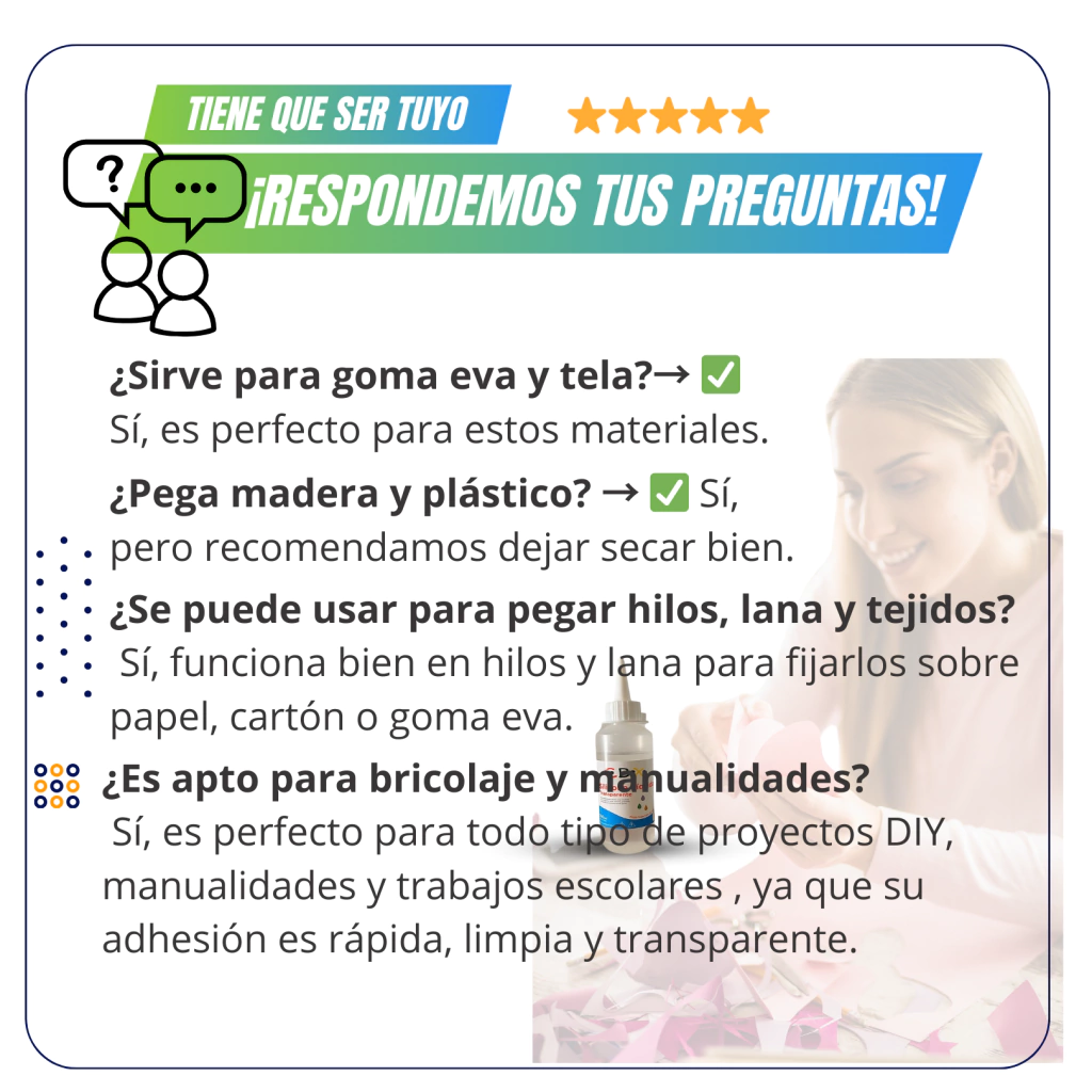 BENEFICIOS DEL PRODUCTO - Adhesión fuerte: Proporciona un pegado duradero y resistente. - Transparente al secar: Deja una terminación limpia y estética, perfecta para trabajos donde la apariencia es clave. - Fácil aplicación: Su fórmula permite una aplicación sencilla y precisa, evitando el desperdicio de material.